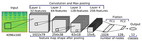 The input shape of the wavelet transformed data is 4096 × 160 pixels (time × frequency-scales). This is the equivalent of a data snippet of 40.96 ms (sampled at 100 kHz), and, hence, contains at least six ‘bumps’ of the balls rolling over an outer ring defect ( Hz). The 160 frequency-scales are distributed up to 11 kHz, which corresponds to the linear frequency range of the MEMS accelerometer.