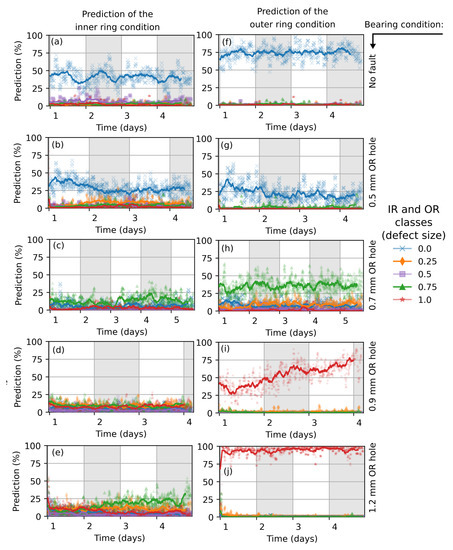 The time dependence of the prediction of the network trained with simulation data is shown in Figure 10. The prediction in percentage gives the probability of the existence of a certain hole size in the inner or outer ring. It essentially stays constant in most cases. In some cases, the behavior indicates changes of the fault (e.g., Figure 10i).The prediction of the outer ring condition of a healthy bearing (f) and bearings with severe faults of 0.9 mm (i) and 1.2 mm (j) hole sizes are very well classified. Note that the fault sizes from measurement slightly differ from the simulated faults which form the output classes. The bearing with an outer ring defect of 0.5 mm (g) is not accurately predicted and is characterized with lower values (significance) of a healthy bearing state. The condition of a bearing with 0.7 mm fault size (h) is indicated with about 40% probability for the presence of a 0.75 mm defect size. The probability of other defects is much lower.