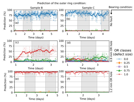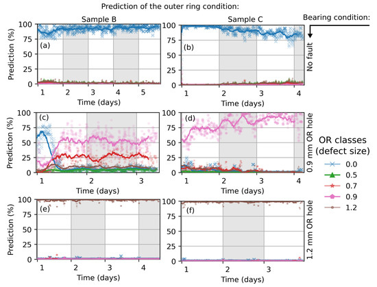 The reproducibility of the classification is investigated by additional measurements, which have been conducted on healthy bearings and bearings with 0.9 mm and 1.2 mm outer ring defects (Figure 11). The network delivers a highly confident classification of the healthy bearings and bearings with 1.2 mm defect size, similar to that shown in Figure 10. There is a run-in phase visible for the ball bearing with 0.9 mm fault size (sample B, Figure 11c) until the network’s prediction stabilizes at 50%. This also reduces the appearance of a clear fault signature, which can be measured by the vibration sensors. Sample C with a 0.9 mm fault size (Figure 11d) is poorly classified (all faults < 25%). Here, a possible deviation from drilling perfection could have an impact on the classification accuracy.