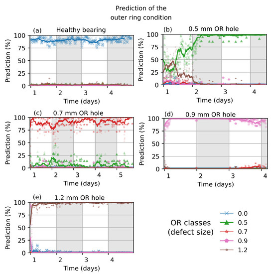 Since no inner ring damage is introduced, the inner ring’s race condition should be classified as a healthy state. The prediction partly works for the healthy bearing (a) and the bearing with 0.5 mm fault size (b). There is a misclassification with almost 0% (<25%) probability of all defect classes for the cases (c), (d) and (e).