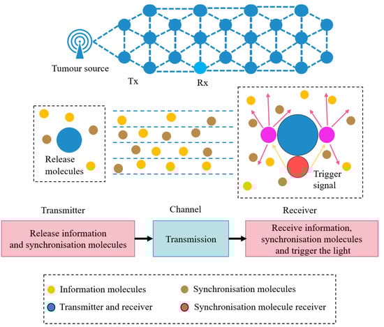The MC system in the IoBNT for biosensing is illustrated in Figure 1. The biosensing signal, generated by the tumor sources, propagates from the transmitter to the receiver. While in the IoBNT network, the nodes are interconnected by way of the MC process, which implements the provitamin D3 molecules as the information carriers. The transmitter releases the information and synchronization molecules; meanwhile, the receiver receives information molecules and then triggers photolysis reactions once detecting the synchronization molecules with a higher diffusion coefficient.