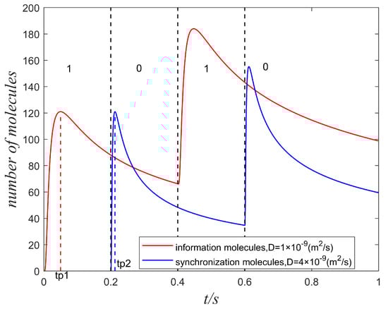The information molecules and synchronization molecules with different diffusion coefficients are transmitted along with symbol sequences 1010, where information molecules are released at the start of symbol “1”, while the synchronization molecules are released during the symbol “0”. denotes that the unit of time is seconds.