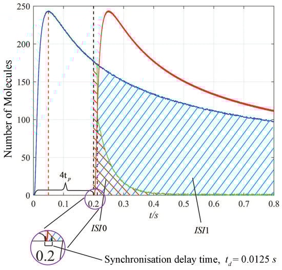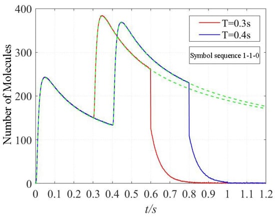 As shown in Figure 4, when the first symbol is transmitted, the amount of ISI depends on the following symbol. During the symbol “0” transmitted, the received signal declines sharply as shown by the green line, which indicates the ISI is mitigated rapidly by the light impulses. Although synchronization molecules with a lower diffusion coefficient can be detected quickly, the delay time is still evaluated. To achieve the large channel capacity and guarantee enough time to receive the information molecules, we set the time intervals between connected symbols .