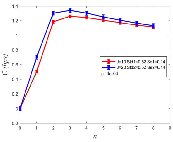 Comparison channel capacity C with the symbol duration between two symbols, , n = 1, …, 8. J denotes the photolysis reaction coefficient. Std and Se denote standard deviations and standard error, respectively.