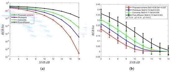 (a) Bit Error Ratio (BER) performance comparison of the proposed method with the methods in the previous reference. dB denotes the unit of signal-to-noise ratio (SNR). (b) Std and Se denote standard deviations and standard error, respectively. p1, p2 and p3 denote the p-values of the comparison between the proposed method with photolysis, convexity and pure diffusion, respectively.