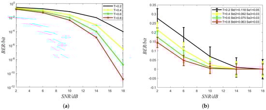 (a) Bit Error ratio (BER) versus signal-to-noise ratio (SNR) with the different symbol interval. dB denotes the unit of SNR. (b) Std and Se denote standard deviations and standard error, respectively.