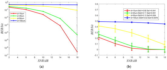 (a) Bit Error Ratio (BER) versus signal-to-noise ratio (SNR) with different distances. dB denotes the unit of SNR. (b) Std and Se denote standard deviations and standard error, respectively.