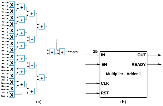 Every neuron of the second and third layers contains the same components except the activation function. In total, there are five multiplicative modules, represented by an X, and five addition modules, represented by “+”, as shown in Figure 9a. The five multipliers and the five adders are represented by a single module called Multiplier - Adder 2 (Figure 9b), which has five inputs (IN); three control signals, (EN), (CLK), and READY; a CLK input; and one output (OUT).