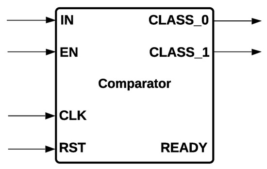Comparator Module: It is the common component of MLP and Logistic Regression that determines the class to be activated: class zero or class one. The module has one data input; one store value; three control signals, EN, RST, and READY; and two outputs, CLASS_0 and CLASS_1, that are determined depending on the input signals. CLASS_0 is activated if the input is bigger than ; if not, CLASS_1 is activated. The comparator module is shown in Figure 6. We remark that a comparator is also used for Decision Trees and SVM. However, their implementation is slightly different; for example, in Decision Tree, there are two outputs that activate the left or right node, respectively, whereas SVM implements two comparators for forming a Hard Margin.