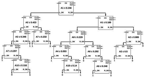For the Decision Tree, the used technique was balanced weights, with the next hyperparameters: the entropy criterion, a maximum depth of 6, a minimum samples split of 2, a minimum samples leaf of 3, and a minimum weight fraction leaf of zero. Every node is formed by a comparator, which has 2 inputs of 32 bits each: A and B. The outputs are called L_OK and R_OK, which activate left and right nodes, respectively. If condition is fulfilled, L_OK takes a value of one, and the left node is activated; if the condition is not fulfilled, R_OK takes a value of one, and the right node is activated. This condition is repeated for every node until a leaf is reached and the class is determined. The tree architecture with a depth of five is shown in Figure 7, where it is shown every value that is stored inside every comparator.