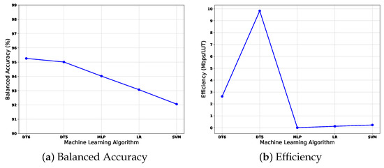Two decision trees with depths of five and six were implemented in our work, whereas Lin Z. et al. [25] developed one architecture, but they implemented it on five different datasets. Choudhury R. et al. [26] developed one architecture, which was applied to five different datasets, obtaining the highest number of LUTs and FFs in this last work with 894,000 and 6488, respectively, followed by Lin Z. et al. [25] with a minimum number of LUTs of 54,198; however, they did not report the number of FFs. Our work obtained the minimum number of LUTs and FFs, where the Decision Tree with a depth of 5 has 320 and 812, respectively, and the Decision Tree with a depth of 6 has 890 and 1389, respectively. In the case of BRAMs, the maximum number was obtained by Lin Z. et al. [25] with 384, followed by Choudhury R. et al. [26] with 228, which also has the highest number of DSPs with 200, followed by Lin Z. et al. [25] with 138. In contrast, our work did not make use of any BRAM or DSP. The reported latency in our work is given in clock cycles (23 and 25) and milliseconds (ms), in contrast, Lin Z. et al. [25] with 0.26 and Choudhury R. et al. [26] with 24. The throughput and efficiency of our work achieve the highest frequency (MHz) with 323.31, followed by Lin Z. et al. [25] with 308 and by Choudhury R. et al. [26] with 62.