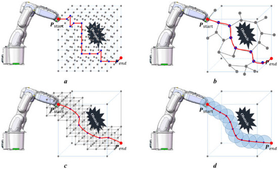 Schematic diagram of four different path-planning strategies for industrial manipulators. Picture (a) shows the planning strategy of map-based planning algorithms such as A*; Picture (b) shows the planning strategy of sampling-based planning algorithms such as RRT, PRM, and APF, etc.; Picture (c) is SbOSMS strategy which combines a map-based planning strategy and a sampling-based planning strategy to reduce both the search space and search time, as well as overcome the defect of random planning results for RRT; Picture (d) shows the proposal of this paper, which changes the node map in picture c into local-global sphere search space around EEF position point during every sampling period.