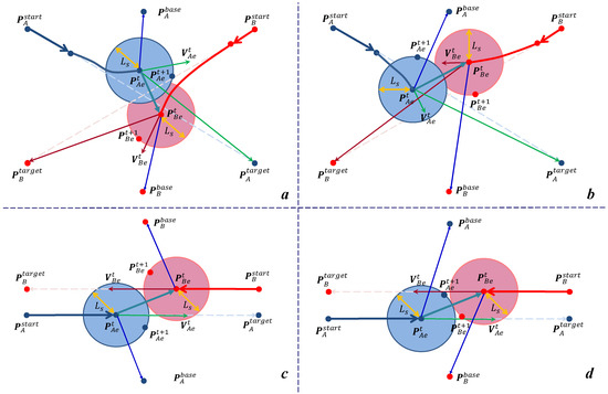 Influence of the relative positions of the dual manipulator EEFs on the obstacle avoidance path-planning strategy. The upper part of Figure 4 (picture a,b) of the dual manipulator system have crossed initial paths, while the bottom half (c,d) is set to initial parallel paths. Meanwhile, the left half of picture a and c corresponds to the interval scenario, (b,d) fall under the interact scenario specified in Figure 4. Different initial paths and coexistence scenarios give rise to various choices of obstacle avoidance points . For the interval scenario, the relative position vector () between manipulator B and A is outside the working space of manipulator A (consisting of vectors (), () and () together). In this case, it is only necessary to consider how to reach its terminal as quickly as possible while avoiding the obstacle to ensure that manipulator A has the safest tendency to move towards its base. However, when it comes to interact scenarios, the relative position vector is in the working space of manipulator A, then the first thing that should be considered for manipulator A is to evade immediately along the direction of its base and proceed to its target after it has wholly bypassed the danger area.