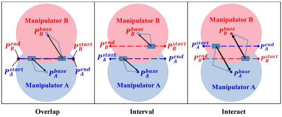 Three dual-manipulator coexistence scenarios. The blue dotted line represents the initial path of manipulator A, and the red dotted line represents the initial path of manipulator B. The blue area is the operation space of manipulator A, and the red area is the operation space of manipulator B. In the scenario of “Overlap”, the initial path of manipulator A is in the operation space of manipulator A and the initial path of manipulator B is in the operation space of manipulator B. In scenario “Interval”, the two initial paths overlap and the EEF points of the two manipulators should be driven back towards their points of departure. In scenario “Interact paths”, the avoidance strategy pushes the EEFs of the two manipulators into the working space of another manipulator, undoubtedly increasing the possibility of collision.