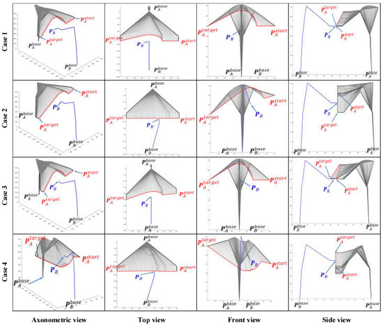 We can simulate the effect of the algorithm proposed in this paper on the path-planning strategy of a dual manipulator system with different initial paths by using the control variables method. Take Case 1 as a benchmark case, both Cases 2 and 4 add displacement in the Z-axis direction of the world coordinate system (WCS), distinguishing the two by the opposite direction of displacement. The displacement of the manipulator A in the Z-axis is a descent from the high to the low coordinate in Case 2, while in Case 4 the situation is reversed. Similarly, and in turn, Case 3 incorporates a Y-axis movement.