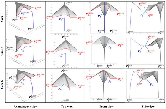 Similarly, when we refer to Case 2 as the benchmark case, based on the fact that both manipulators have relative motions in the dual manipulator avoidance, Cases 2 and 4 in Figure 8 are fused into Case 5 in Figure 13, which is used to show how this paper’s proposal operates when adding the displacement of the initial path in the Z-axis direction of the WCS; In Figure 13, Cases 1–3 investigate the effect of the relative distance between two manipulators on the planning results of the algorithm, similar to cases 1, 5 and 6 in single manipulator avoidance; Case 4 intersects the paths of the two manipulators in the X-Y plane of the world coordinate system, similar to Case 3 in Figure 8, aiming to reveal the specific simulation results of the algorithm for displacement increments in the Y-axis direction in the WCS.