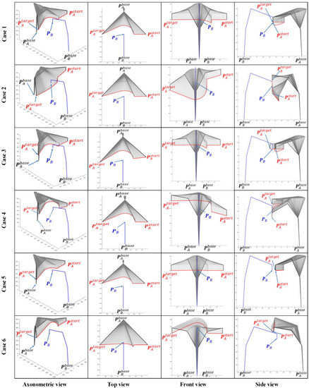 When or , the dual manipulators avoidance strategy will be converted to a single manipulator avoidance strategy. Here, we define to show the simulation results of single manipulator avoidance. The space coordinates of the base of manipulator A are (0, 0, 0) while manipulator B’s base is situated at (0, −900, 0). Six different path planning cases and the corresponding simulation results are presented and compared in Figure 7 and Figure 8 intensively.