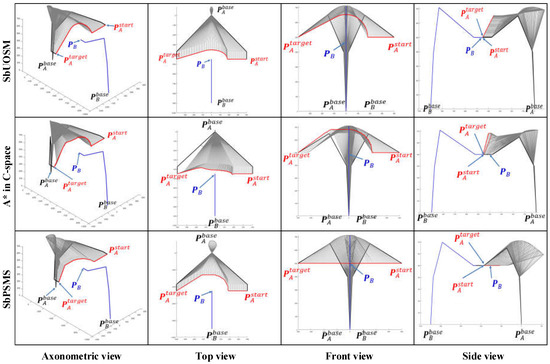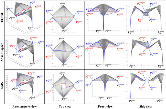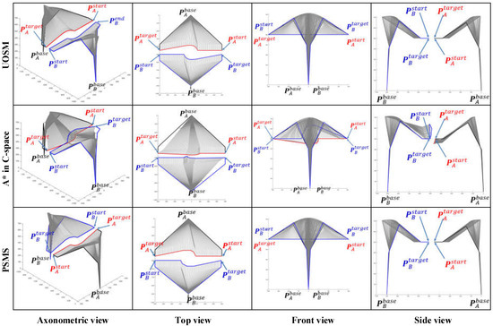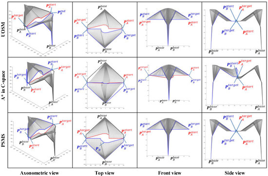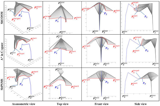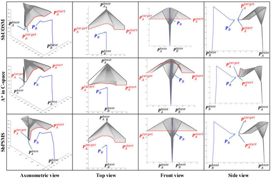 Figure 14, Figure 15 and Figure 16 focus on the difference between the results of the three different algorithms. The analogous results for dual manipulator avoidance are similar to those for single manipulator avoidance. SbUOSM can always produce smoother paths. The results of the map search algorithm are always the most space-complex. Except for Figure 16, both SbUOSM and SbOSMS perform avoidance only in the X-Y plane of the world coordinate system. In Figure 16, the path points of SbUOMS are all dis-tributed in the X-Z plane, mainly because the dimensions of the end links are more distributed in the X-Y plane than in the X-Z plane.