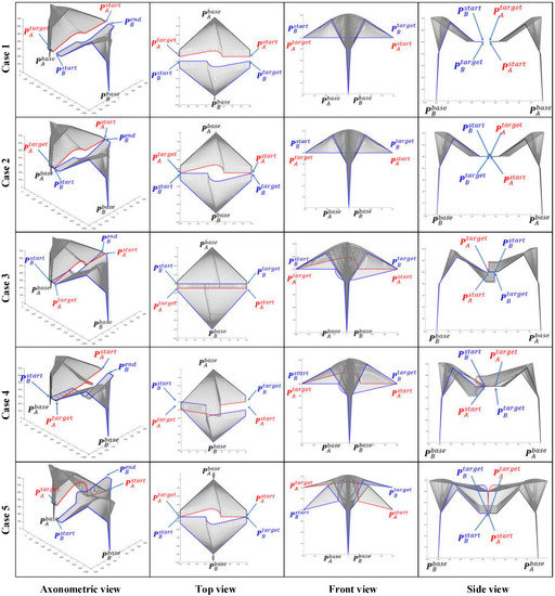 In order to verify the generality of our algorithm, we re-simulated all cases by simply changing the corresponding EEF pose vectors without changing their individual space coordinates. When the pose vector of the EEF of manipulator A and B are set to and , the corresponding simulation results are shown in Figure 9.