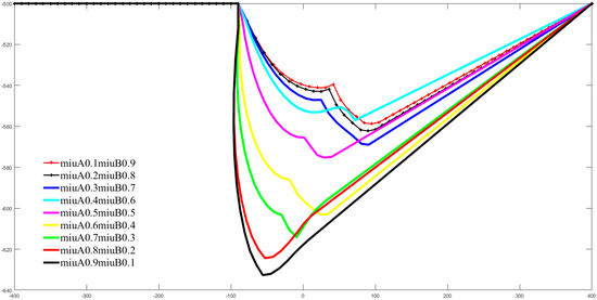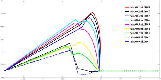 From Equation (1) we can also visualize that the planning results are also directly governed by the weighting factors and . Figure 17 and Figure 18 illustrate visually the effect of different values of on the shape of the end-effector paths of manipulators A and B, respectively, in the form of multicolored graphs. In Figure 17 and Figure 18, the horizontal axis is the coordinate of the end of the corresponding manipulator under the X axis of the WCS, and the vertical axis is the coordinate of the end of the corresponding manipulator under the Y axis of the WCS. Due to the constraint , when increases, decreases. Observing Figure 17 and Figure 18 together, as gradually increases from 0.1 to 0.9, the maximum offset of the path planned at the end of manipulator arm A on the Y-axis is incrementally reduced, and the opposite is true for manipulator B. From the geometric properties of the path curve, the curvature of the path of manipulator A enlarges and the curvature of the path of manipulator B diminishes.