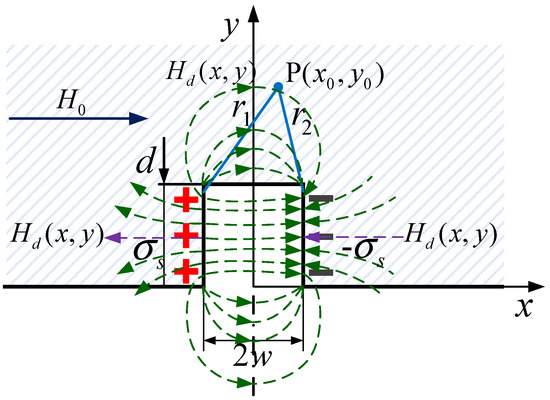 In a magnetized state, the magnetic dipoles inside a material are connected end to end such that the positive and negative charges only appear on the cross section of the material, such as on the side of a defect. The property generated by the magnetic charges is often calculated by using a magnetic dipole model [23,24]. The opposite magnetic polarities with a line density of are assumed to be uniformly distributed on the walls of a rectangle defect. The magnetic charges distributed over the length of the left sidewall of the defect are described as . The magnetic field generated by the magnetic charges can be expressed by