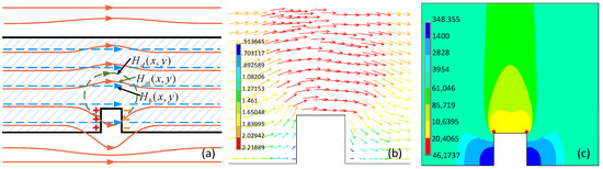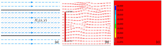 The magnetic field in the material consists of not only the caused by the magnetic charges presented in Figure 2 but also the original magnetic field without the slot . When there is no slot in the material, the magnetic field lines are in the same direction as the incident field lines outside the material. Thus, the magnetic flux travels directly through the interior of the material without any perturbation, as shown in Figure 3a,b, which were obtained by FEA. The magnetic field is distributed evenly throughout the material without any magnetic field perturbation, as indicated in Figure 3c.