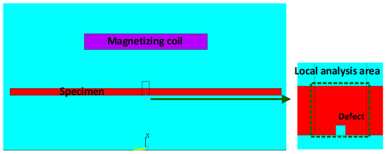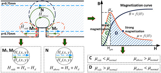 In summary, researchers in both academia and engineering generally believe that magnetic permeability is evenly distributed in materials after magnetization; that is, the macroscopic discontinuities will not change the uniformity of the permeability distribution [22], as shown in Figure 1. Consequently, researchers seldom note the permeability variation in space caused by a defect in ferromagnetic materials. The “uniformity theory” about permeability is based on a uniform change of a magnetic field within a material; however, the internal magnetic field is strongly affected by a discontinuity under the DC magnetization and the permeability varies greatly with the level of the applied field. It is worth noting that the previous simple equivalent of permeability may result in insufficient MB-ECT measurements and applications.