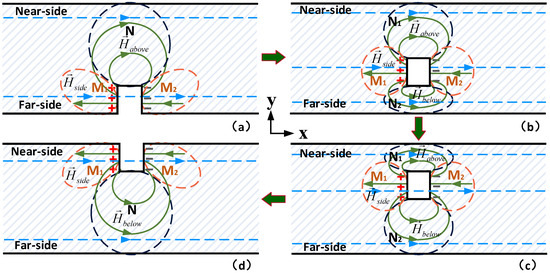 The above analysis is based on the far-side surface defects, but the magnetic permeability perturbations appear not only in far-side surface defects but also in the internal defects (not surface breaking defect) and near-side surface defects, so the location of the defects is further considered, as shown in Figure 6. The defects are located inside the material and do not touch the upper and lower surfaces, as shown in Figure 6b,c. The magnetic charge generating magnetic field forms the magnetic field perturbation in the regions above the defect and the region below the defect, which are recorded as the N1 and N2. In the left and right regions of the defect, the magnetic field perturbation is symmetrically distributed about the centerline of the defect. However, in the upper and lower regions of the defect, due to the limitation of the diffusion range, the magnetic field perturbation changes with the buried depth of the defect. As the buried depth of the defect is gradually reduced, it eventually evolves into the near-side surface defect, as shown in Figure 6d. At this time, the magnetic field perturbation regions M1 and M2 move to the vicinity of the near-side surface, and the magnetic field perturbation region N moves to the region directly below the defect. In the process of (a–d) shown in Figure 6, the magnetic permeability perturbation regions M1 and M2 move upward in the y direction while the N region is divided into N1 and N2, eventually moving from the top of the defect to the bottom of the defect in the y direction.