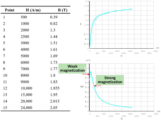 From the perspective of the physical properties, the nonlinear permeability () of a ferromagnetic substance reaches a maximum and later declines due to saturation, as shown in Figure 5 [26]. The complete curve of the ferromagnetic material is divided into ascending and descending stages according to the peak .