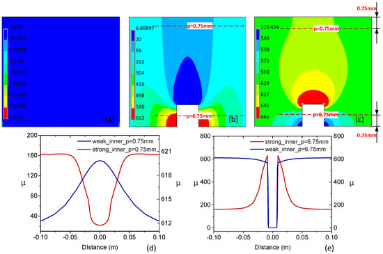 Relative permeability distribution obtained by simulations. (a–c) show the magnetic permeability distribution under no-defect, strong magnetization, and weak magnetization, respectively. (d,e) represent the permeability change curves of the path p = 0.75 mm and the path p = 6.75 mm.