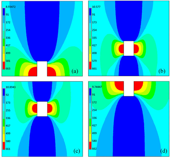 The finite element analysis of the defects with different buried depths is performed to obtain the magnetic permeability distribution cloud around the defect, as shown in Figure 10. Consistent with the previous analysis, magnetic permeability perturbation occurs around the defects of different buried depths. For the far-side surface defect, the magnetic permeability perturbation mainly occurs on the side regions and above region of the defect and spreads to the surface layer of the material. It is worth noting that in Figure 10b,c, magnetic permeability perturbations are formed in the regions around the internal defects, especially above and below the defects, which spread to the near-side surface and the far-side surface of the material. For the surface defect, the magnetic permeability perturbation region above the defect gradually disappears, but the magnetic permeability perturbation regions on both sides of the defect move to the surface layer to form a discontinuity region with the defect.