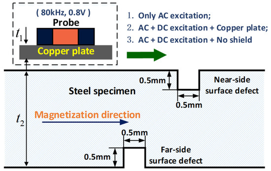 For a thicker specimen ( = 11.5 mm), the magnetic flux leakage is too small to be detected due to the magnetic shielding of the wall despite the fact that the DC magnetization is applied to the specimen. In addition, the copper shield affects the AC excitation owing to its skin effect and there is no response from the far-side surface defect. In addition, when the thickness of the material increases, the permeability perturbation in the surface layer of the material becomes weaker, which results in a smaller testing signal.