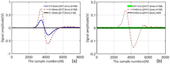 As shown in Figure 12a,b, the far-side surface defect cannot be detected by only the AC excitation, owing to the skin effect of the eddy current; meanwhile, the signal amplitude is significantly reduced but not disappeared as in the case of the shield ( = 1 mm), where there exists both the AC and DC excitation. In the MB-ECT method, several magnetic lines of force pass through the specimen and exit out of the positive side, which is a mutated disturbed field compared to the moving induction coil. The copper shield does not affect the MFL signal, but it affects the AC excitation as a result of the skin effect under the AC magnetic field.