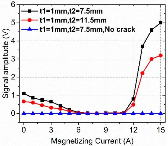 The skin depth is about 0.347 mm based on μ = 10 and σ = 3.3 e7 S/m (conductivity). The skin depth is sufficiently small enough that the far side is more than (the effective inspection depth). For the far-side surface defect, the permeability perturbation above the defect causes the eddy current perturbation. However, the near-side surface defect and the permeability perturbation on both sides of the defect all have an effect on the eddy currents in the surface layer. In fact, the two factors work together under DC magnetization and cannot be separated, which makes it impossible to determine the signal source from a single set of signals. Therefore, when we conduct experiments on the near-side surface defect, the relationship between the signal amplitude and the magnetizing current is mainly considered.