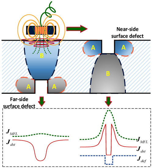 Based on the previous analysis, the permeability perturbation always appears with the existence of defects, including a near-side surface defect and a far-side surface defect, as shown in Figure 14. According to the equivalent source method, the defect is equivalent to a current source and the disturbed field caused by the crack is equivalent to a field due to the equivalent current source. In the MB-ECT method, the total disturbed field mainly consists of the disturbed field caused by the crack, the disturbed field caused by the permeability distortion, and the magnetic leakage field, which is equivalent to the current source , as described in Equations (8) and (9) [28]. Actually, the skin effect always limits the eddy current to reach the far-side surface defect (buried depth > three times penetration depth) even if the permeability decreases to one, and then Equation (5) can be expressed as Equation (10).