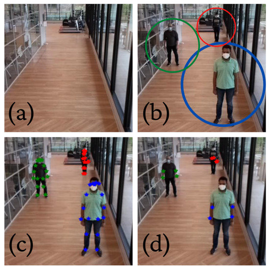 PoseNet [75] for human pose detection. (a) We show the scene without any humans. (b) The scene with three humans standing. (c) The identified keypoints using PoseNet have been overlaid on the individual humans. (d) The keypoints corresponding to the elbows and wrists have been retained. This is useful for analyzing hand movements.