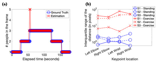 Results for occupancy estimation and activity phenotyping. (a) The comparison between the ground truth and the estimation by the algorithm for the number of people in each video frame is shown. (b) We show the interquartile range of the distance (in pixels) between the keypoints from consecutive frames (sampling frequency = 1 Hz) for three subjects standing and performing exercise.