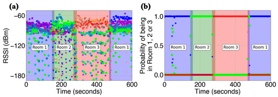 Further, any RSSI value less than dBm was clamped to dBm to have all RSSI values in a fixed range. We set to , which corresponded to maintaining the previous value for 5 s before the RSSI values were decayed when the RSSI values were missing. Further, we computed the average RSSI signal for each room by computing the mean value of the RSSI signals captured by the three RPis in each room. We used the softmax function to obtain a probability vector that gave the probability of the human subject with the Bluetooth beacon to be present in each of the three rooms at any given point in time. The averaging of RSSI values from multiple RPi receivers and the further usage of the softmax function significantly suppressed the effect of noisy RSSI samples.