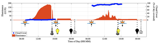 To perform ambient data logging, we set up an RPi with the Waveshare TCS34725 color sensor in a built environment. The RPi was loaded with the associated software needed to capture the ambient light intensity values. Table 4 provides a timeline of events that occurred during ambient light data capture. The duration between 1 a.m. and 2 a.m. was reserved for data upload, and no data capture was performed during this period. The color sensor was set up in a place that received natural sunlight during the day and received light from light sources in the room during the night. The lights in the room were turned ON when the natural sunlight was not adequate for a normal human lifestyle. The lights in the room remained ON until “sleep time” of the residents in the built environment when the lights were turned OFF. We recorded the ambient light data for two consecutive days. In parallel, we tracked the weather conditions of the data collection site and recorded the minute-to-minute local cloud cover information. With this setup, we studied the effect of cloud cover, sunrise and sunset times, artificial lights in the room, and buildings around the data collection site on the ambient light data captured by the color sensor. We divided the entire time period into 4 sections: , , , . Here, represents the day-period (sunrise to sunset) on the first day when the skies were clear, represents the first night (sunset to sunrise), represents the day-period (sunrise to sunset) on the second day when the skies were extremely cloudy (average cloud cover > 80%), and represents the second night (sunset to sunrise). Since the cloud cover information during the night had little or no effect on the ambient light intensity in the room, in our analysis, we only used the cloud cover data tracked during and .