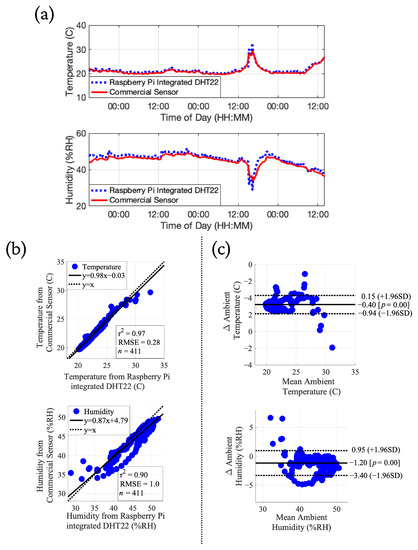 We validated the DHT22 temperature and humidity sensor against a commercially available sensor in this experiment. We set up an RPi with the DHT22 sensor in a built environment. The RPi was loaded with the necessary software to continuously capture temperature and humidity values and the associated UTC timestamps. We collected the temperature () and humidity () values with this setup at a sampling frequency of 1Hz for three consecutive days (about 72 h). Further, we set up the ORIA mini Bluetooth Temperature-Humidity sensor (a commercial sensor) beside our RPi setup and simultaneously performed temperature () and humidity () measurements using the commercial sensor. The commercial sensor allowed the export of the recorded and measurements in the form of comma-separated value files via an Android application. The commercial sensor output contained measurement values at a sampling rate of 0.001667 Hz (one sample per 10 min). Hence, we retrospectively processed the and measurements captured by the DHT22 sensor to match the number of samples and the measurement timestamps corresponding to the commercial sensor via the following procedure. For every timestamp () at which we had the temperature and humidity values from the commercial sensor, we constructed a 10-min window which spanned from min) to . We collated all and measurements in this time window and computed the mean value of these measurements to obtain and . We then compared the with and with by plotting the signals one over the other. Further, we performed correlation analysis and fit separate linear models for the temperature and humidity measurements. Finally, we created separate Bland-Altman plots for the temperature and humidity measurements.