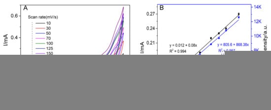 (A) Impact of scan rates vs. CVs and (B) Correlation of peak current and the ECL signal vs. square root of scan rate.