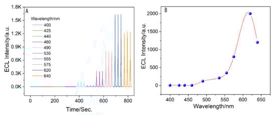 To reveal the ECL mechanism, the ECL spectrum was measured by using wavelength filters of 400, 425, 440, 460, 490, 535, 555, 575, 620, and 640 nm. As shown in Figure 3, the wavelength of the maximum ECL emission was ~620 nm, which was consistent with that of Ru(bpy)32+ ECL in the literatures [37,38,39]. The mechanism of the Ru(bpy)32+/AZA ECL was proposed in Equations (1)–(5). Sweeping the potential anodically at GCE resulted in the oxidation of Ru(bpy)32+ to Ru(bpy)33+ (Equation (1)) and the oxidation of AZA to AZA● (Equation (2)). AZA could also be oxidized by Ru(bpy)33+ to AZA● (Equation (3)). Thereafter, Ru(bpy)33+ was reduced by AZA● to produce Ru(bpy)32+* (Equation (4)). Finally, Ru(bpy)32+* emitted light after relaxation at λmax of ~620 nm (Equation (5)).