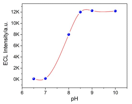 To reveal the impact of the pH on the ECL signal, a series of pHs ranging from 6.5 to 10 was investigated. As demonstrated in Figure 4, a very weak ECL intensity was observed at a pH ranging from 6.5 to 7.0. A significant increase in the ECL signal was observed when the pH increased from 8.0 to 10.0. Therefore, a pH of 8.5 was selected as the optimum pH for the next experiments.