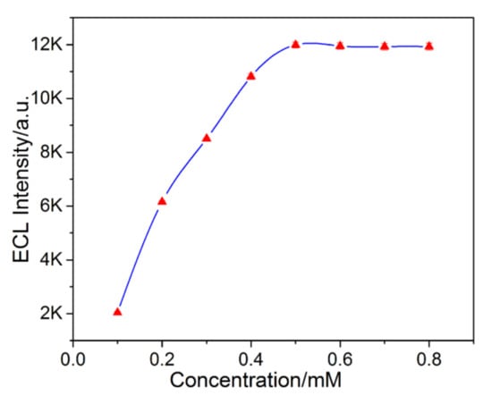 Various concentrations of Ru(bpy)32+ (0.1–1.0 mM) were investigated to study the impact of Ru(bpy)32+ concentration on the ECL signals of the Ru(bpy)32+/AZA ECL platform. As clearly illustrated in Figure 5, a sharp increase in ECL intensities was observed proportionally with the increase in the Ru(bpy)32+ concentration at a range of 0.1–0.5 mM. Almost no significant increment in the ECL signal was observed when the concentration of Ru(bpy)32+ was higher than 0.5 mM. Thus, 0.5 mM of Ru(bpy)32+ was used as the optimum concentration for subsequent experiments.