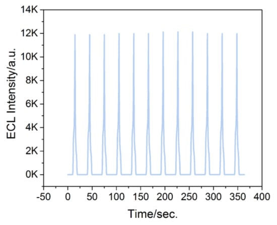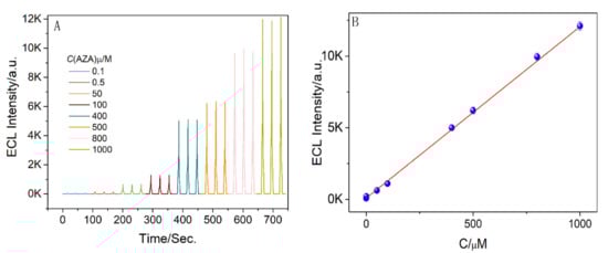As illustrated from Figure 6A, as the concentrations of AZA increased, the ECL intensities increased proportionally. Thus, the developed ECL platform could detect and quantify AZA efficiently. Notably, a linear relationship between ECL intensities and the concentration of AZA (0.1–1000 μM) was obtained with the regression equation of IECL = 11.97C (μM) + 81.39 (R2 = 0.996). The limit of detection (S/N = 3) reached 0.07 μM. The sensitivity of our method was comparable to that of the HPLC-UV method coupled with solid-phase microextraction, although our method did not use solid-phase microextraction [40]. Keeping the potential sweep anodically for twelve cycles and successive measurements of 1.0 mM AZA and 0.5 mM Ru(bpy)32+, the obtained RSD was 3.31%, indicating the precision of the method (Figure 7).