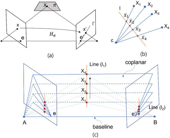 Hartley and Zisserman (2003, 259) stated that the epipolar line is the projection in the second image of the ray from the point x through the camera center C of the first camera. Thus, there is a map from a point in one image to its corresponding epipolar line in the other image, which derives the homogeneous representative. The ray corresponding to a point is extended to meet the plane in a point in Figure 1a. Hartley and Zisserman (2003, 259) defined epipolar lines as follows: “An epipolar line is the intersection of an epipolar plane with the image plane. All epipolar lines intersect at the epipole. An epipolar plane intersects the left and right image planes in epipolar lines, and defines the correspondence between the lines”. As scholars have pointed out, a geometric derivation of corresponding points: