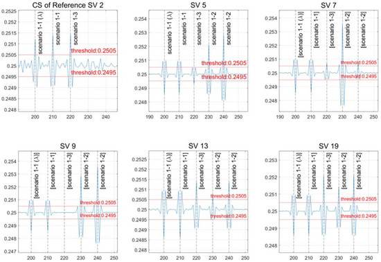 Scenario “1-1” describes a scenario in which all detected CS sizes are the same and are exceeded in the same direction (indicating the same threshold). Scenario “1-1” shows that a CS is formed in all channels with the same magnitude and direction, whereas a CS is generated just for the reference satellite at 200 and 210 s.