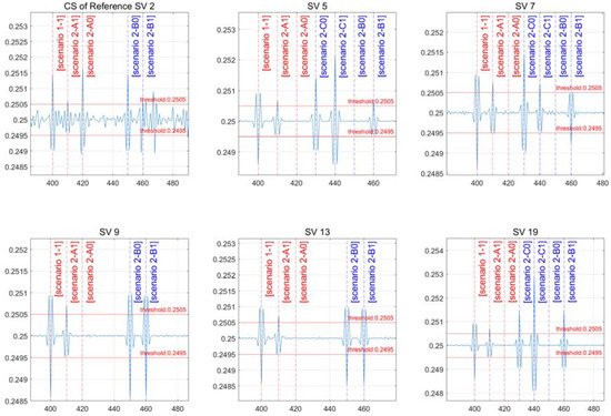 The circumstances of scenarios “2-B0” and “2-B1” demand extensive verification since a CS can be identified in all channels or only in channels where a CS does not occur. The cross-ratio of a single differential value validates if a CS has happened in each channel, as shown in Figure 9, allowing for unambiguous CS detection. Even if a CS is not identified, as indicated in Table 6 below, it is required to check whether a CS is detected using the cross-ratio of the single differential measurement.