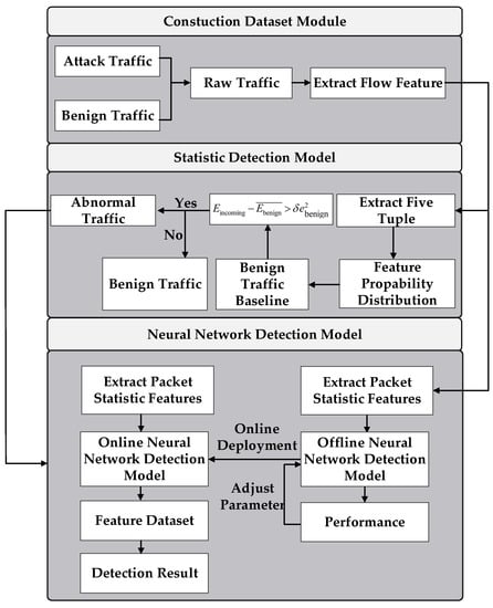 The statistical detection module is used to establish the feature distribution of malicious behaviors and calculate the flow similarity in the time window. Then, by comparing it to the threshold, the statistical detection module outputs the abnormal traffic.