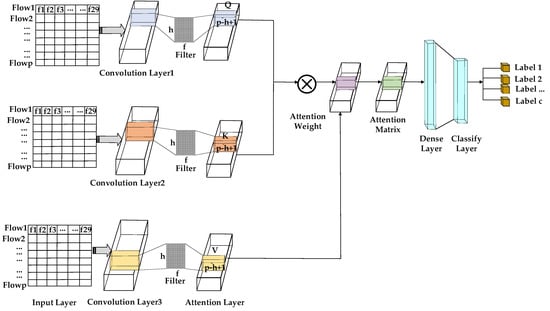 Input Layer: We extracted the features of the packet header and payload in the abnormal traffic obtained by the MFPK detection method. In this first layer, it takes as input a traffic flow represented by a feature matrix F of size . F contains individual p flow vectors in the interval window ∆T, and each flow vector f is 29.
